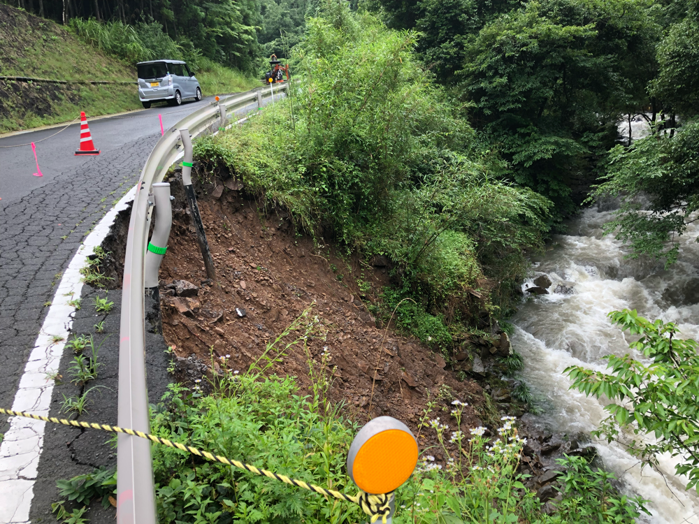 東有田岩美町竹の林集落より300メーター玖珠寄りの県道の路肩が崩壊。地元から連絡があり調査。以前から豪雨により路肩が下がっていたので県に要望していましたが未実施でした。県は現地調査しました。